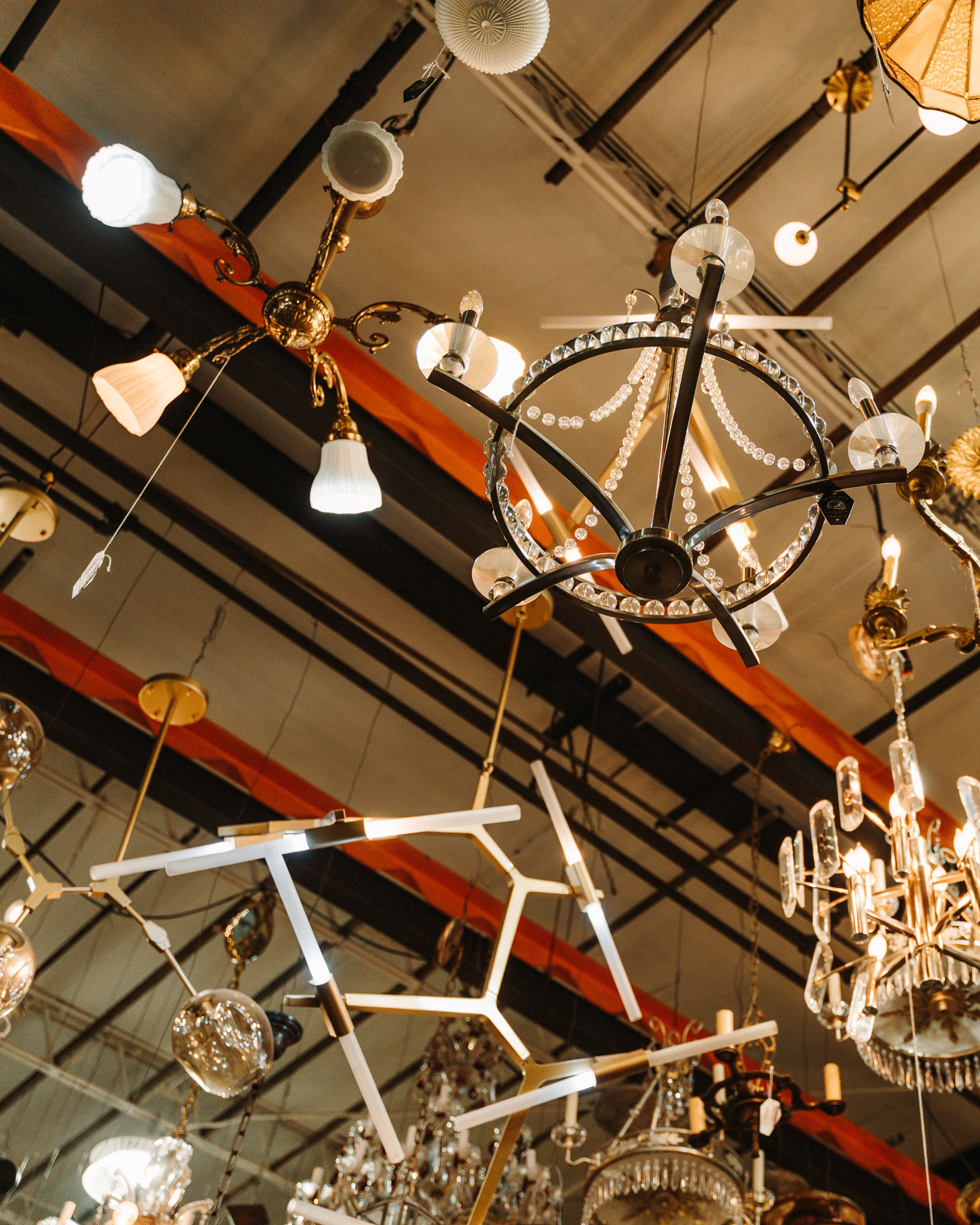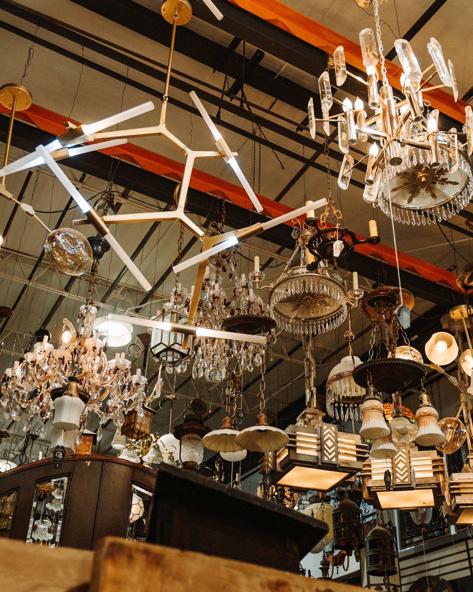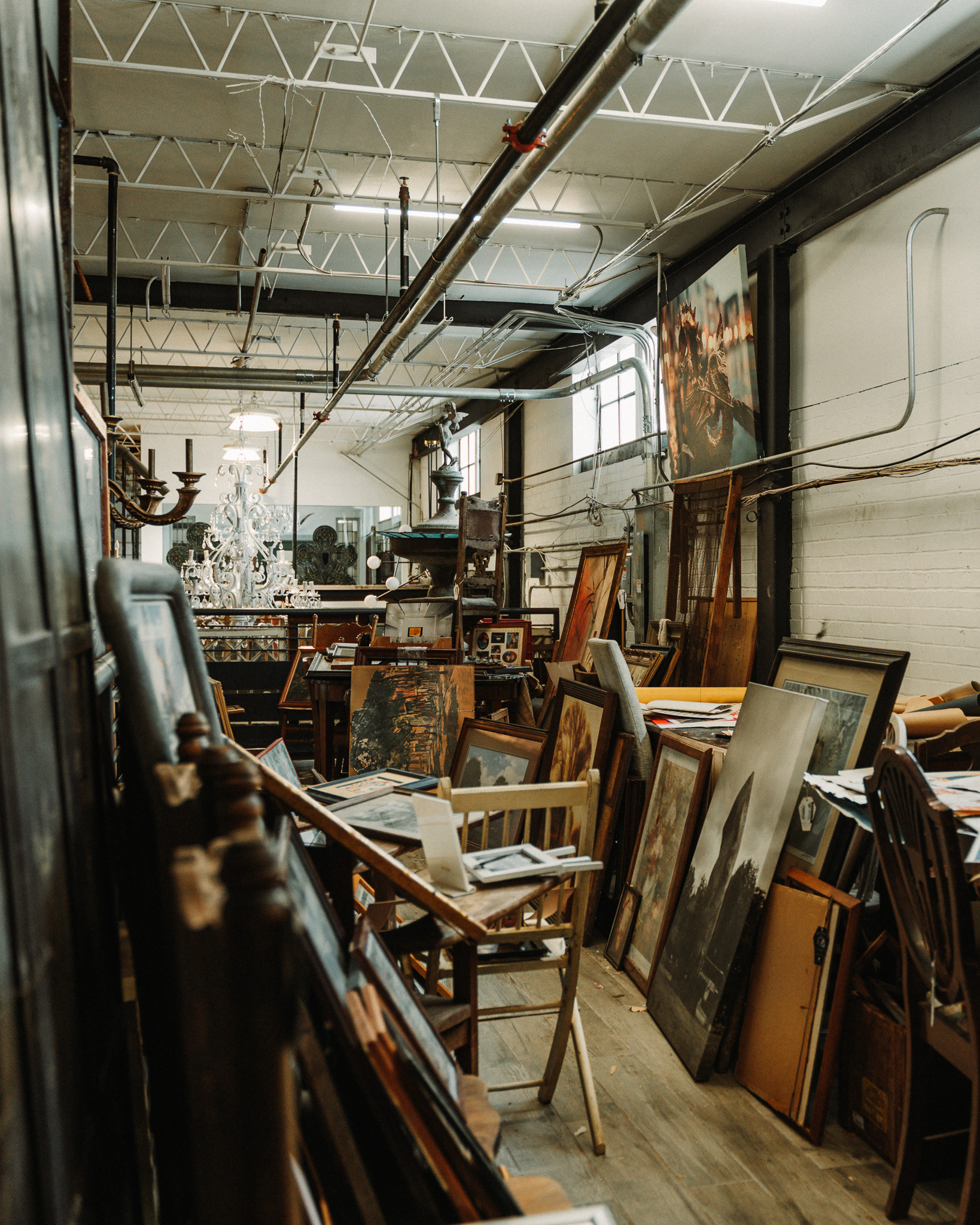 The ceilings climb to 22 feet. The room holds massive architectural pieces that would swallow a normal store whole. And the building itself has history: it originally served as a 1940s Caterpillar facility, complete with cranes that are still operational today.