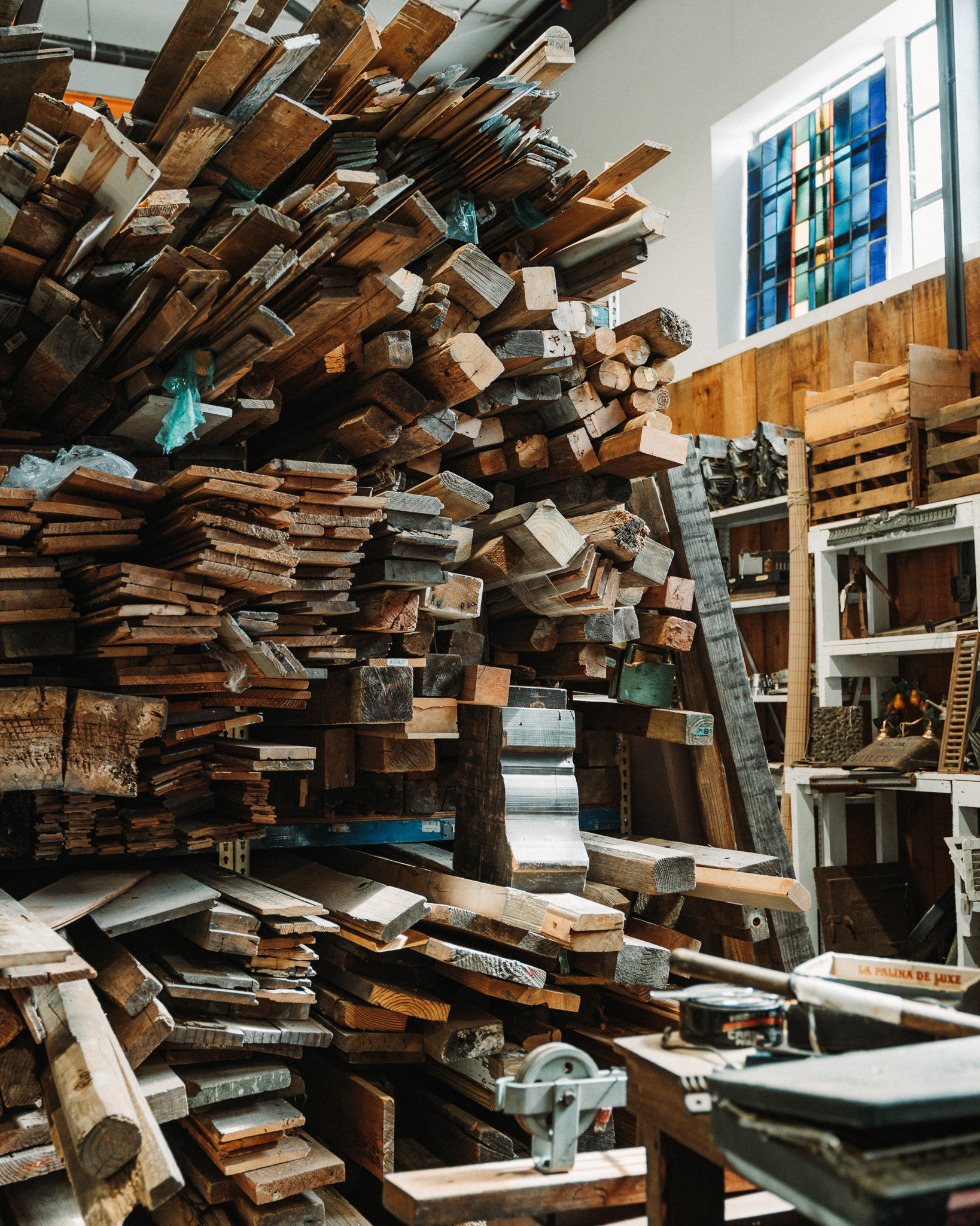 It’s the picker section. Wood that looks rough until you realize what it can become. Curran admits he’s the number one customer, pulling from it for restorations, framing, and shop projects. Marymar calls it their Home Depot, except boutique.