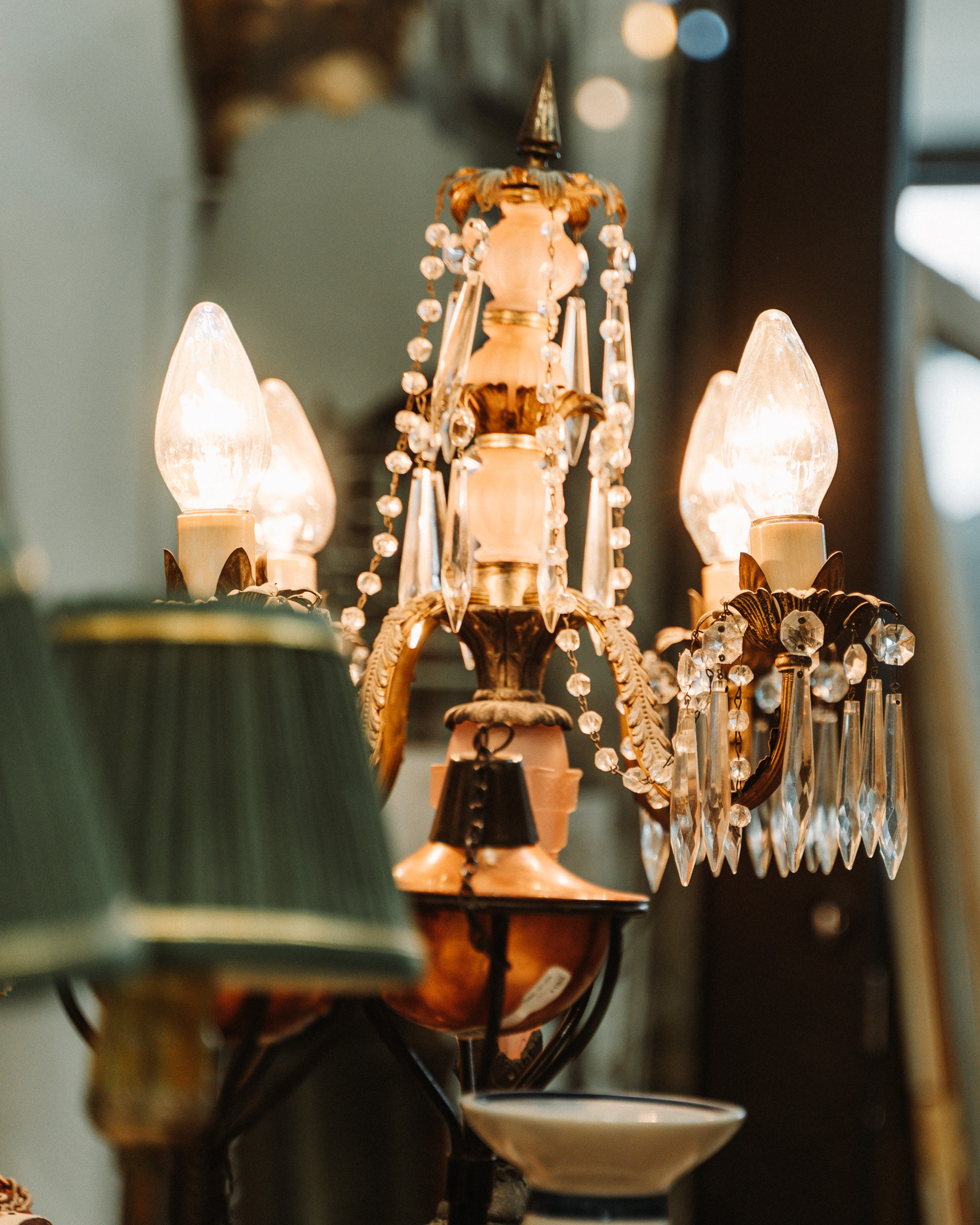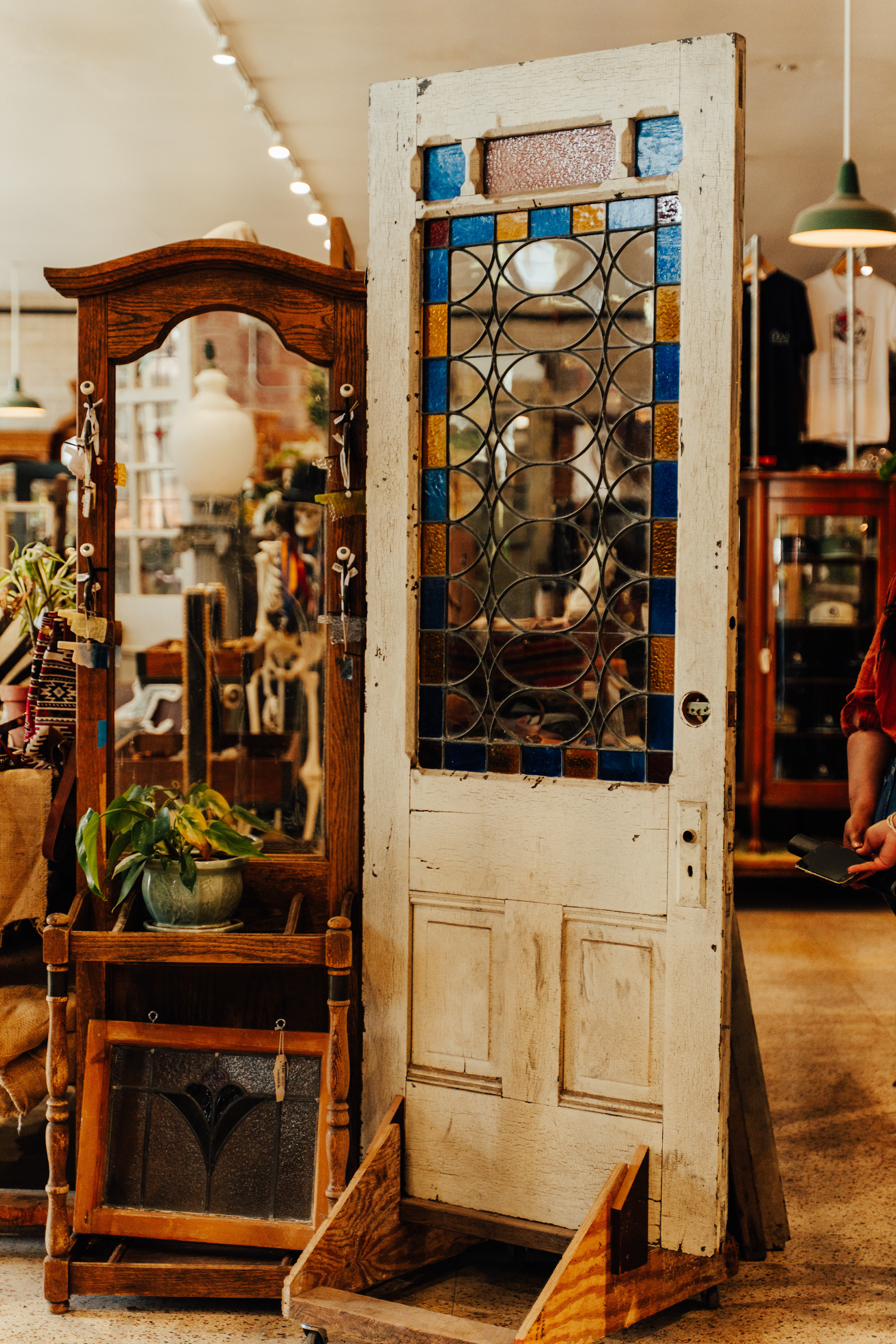 Stained glass filters natural light across feature pieces and curated vignettes. Curran points out his favorite glass in the shop, a rare set of German glass that dates back to the 1700s. It made its way to Kansas in the 1800s, and years later, Curran and Marymar bought it on Marymar’s birthday after a museum trip that turned into one of those “we cannot leave this behind” moments.