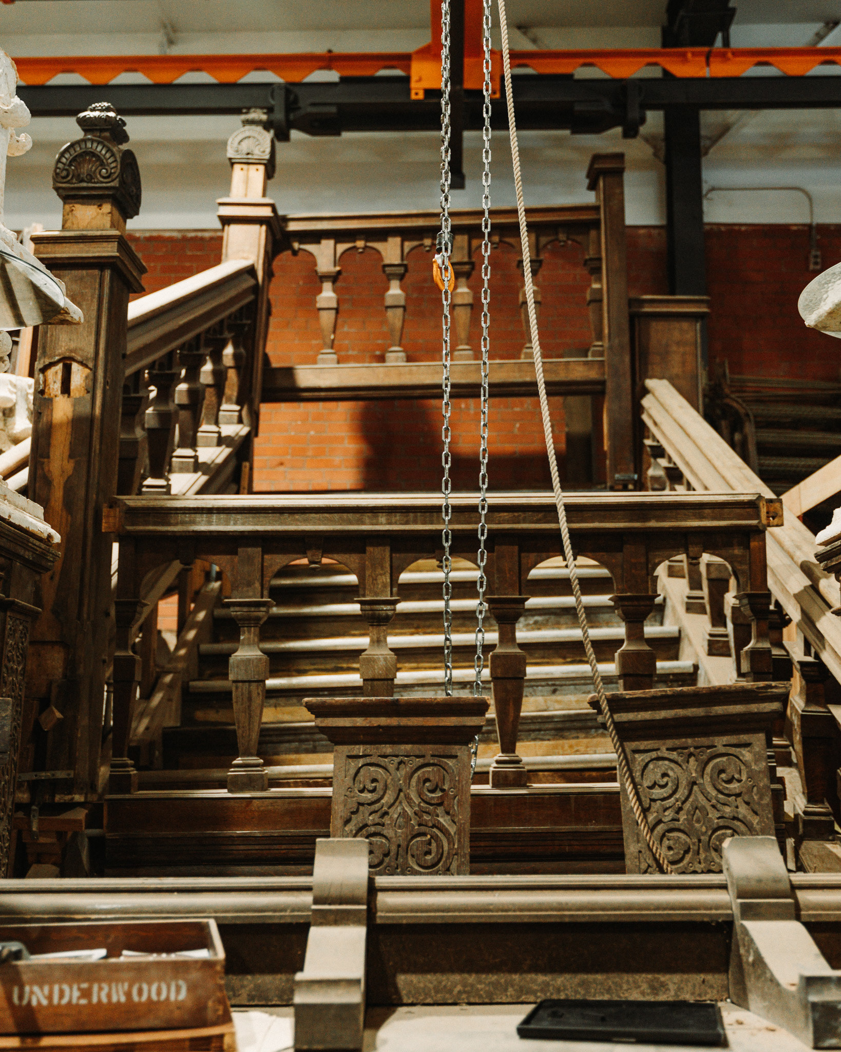 Those cranes were built to move heavy machinery. Now they’re used to hang, lift, and curate gigantic salvage pieces that would be impossible to handle otherwise.